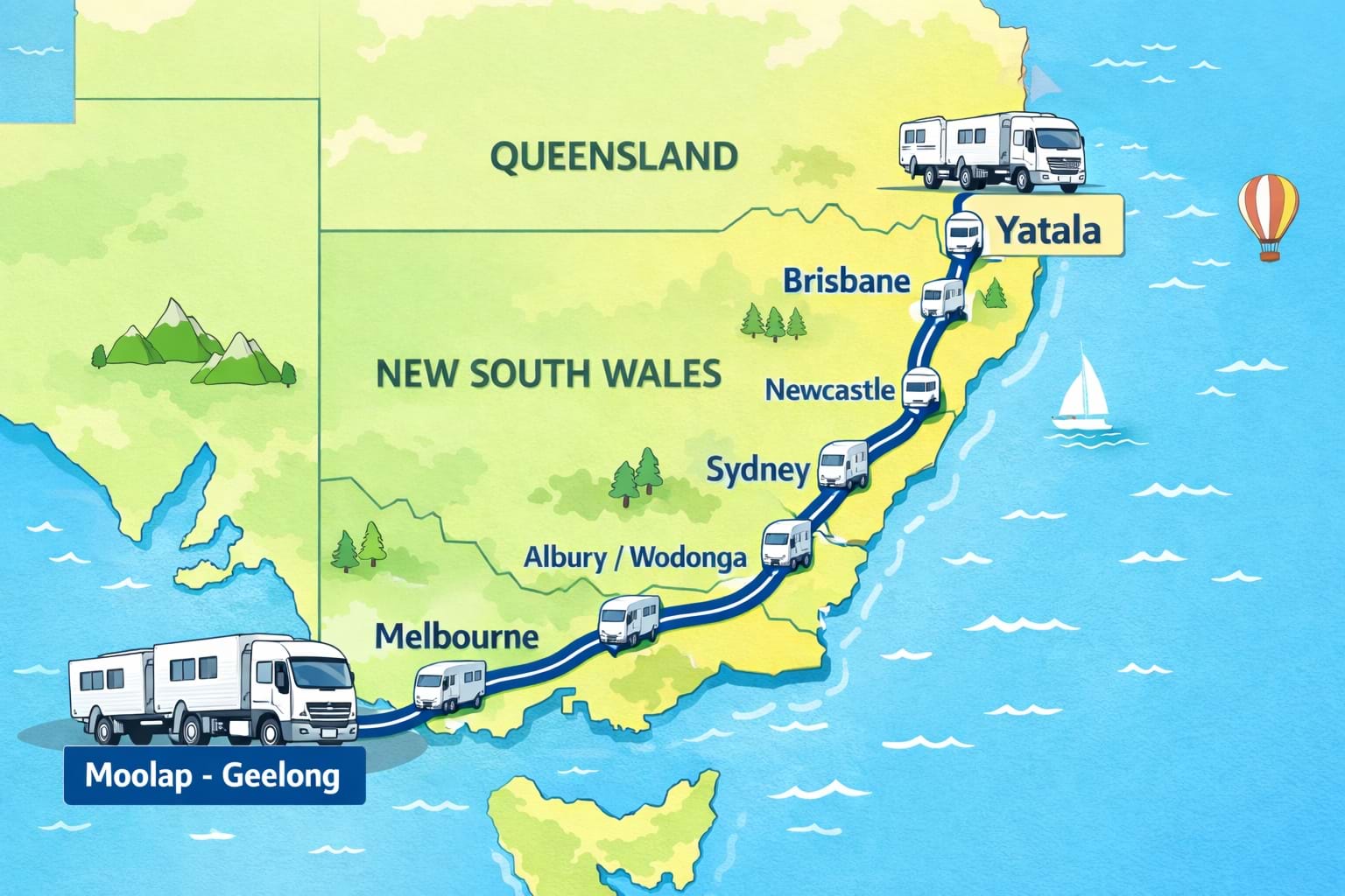 - White glove interstate caravan transport between Melbourne and Brisbane.